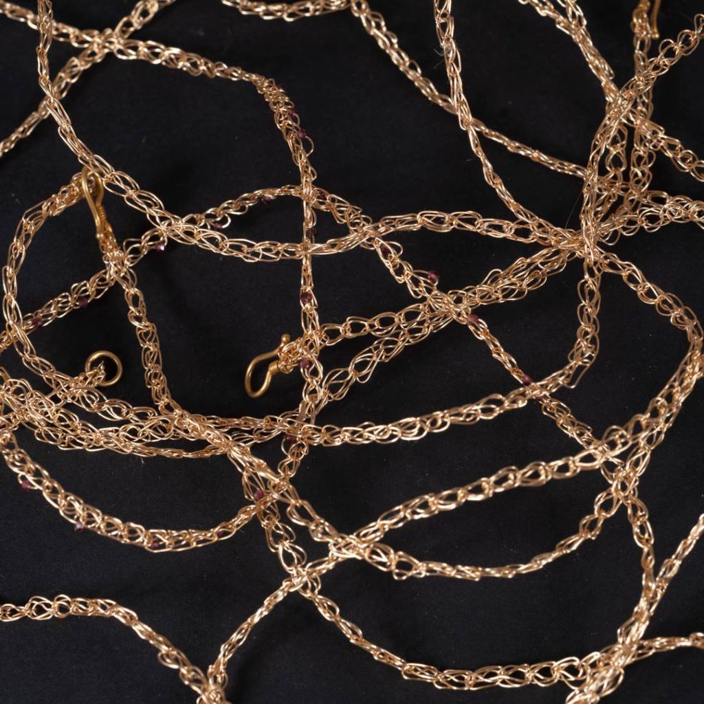 Des fils plaqués or, crochetés à la main, entrelacent perles, pierres ou cristaux dans un travail minutieux, tout en souplesse. Une technique qui allie artisanat et poésie.